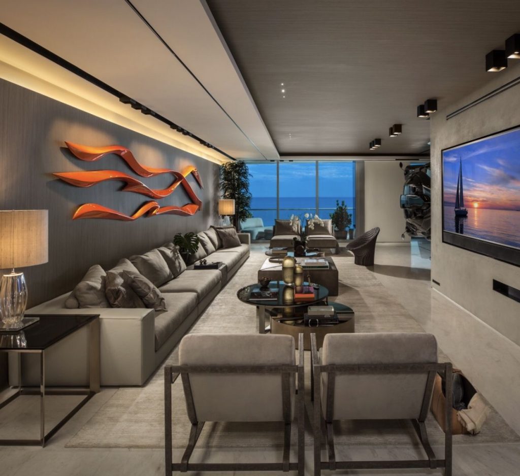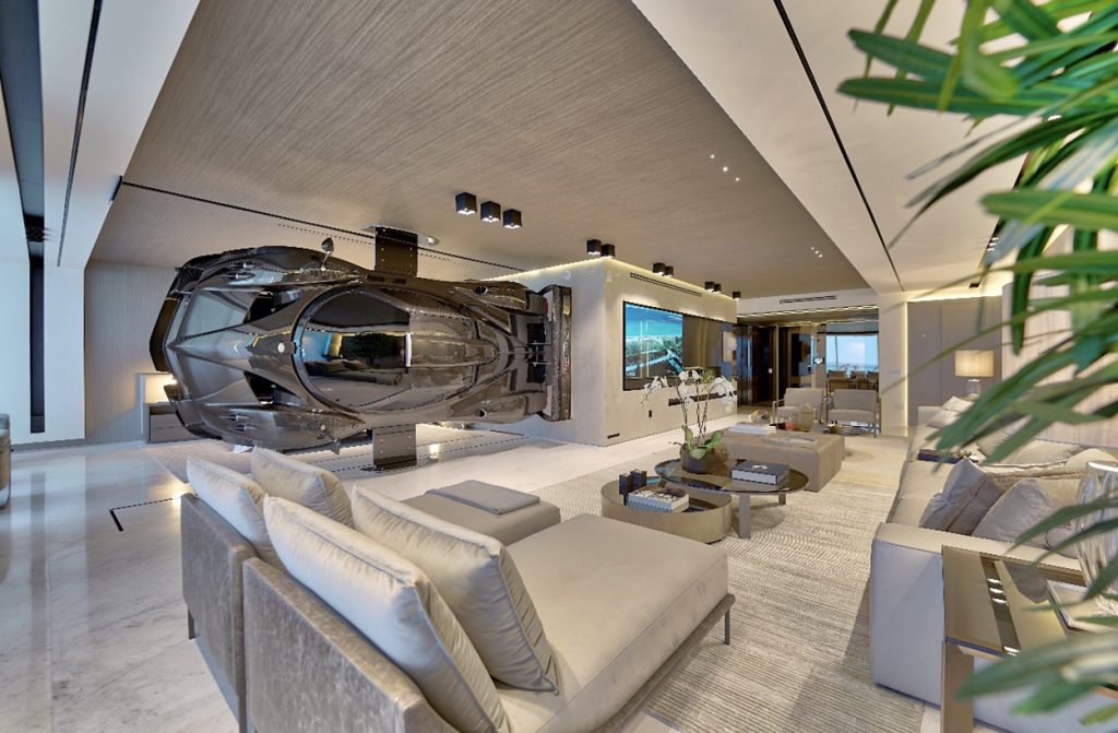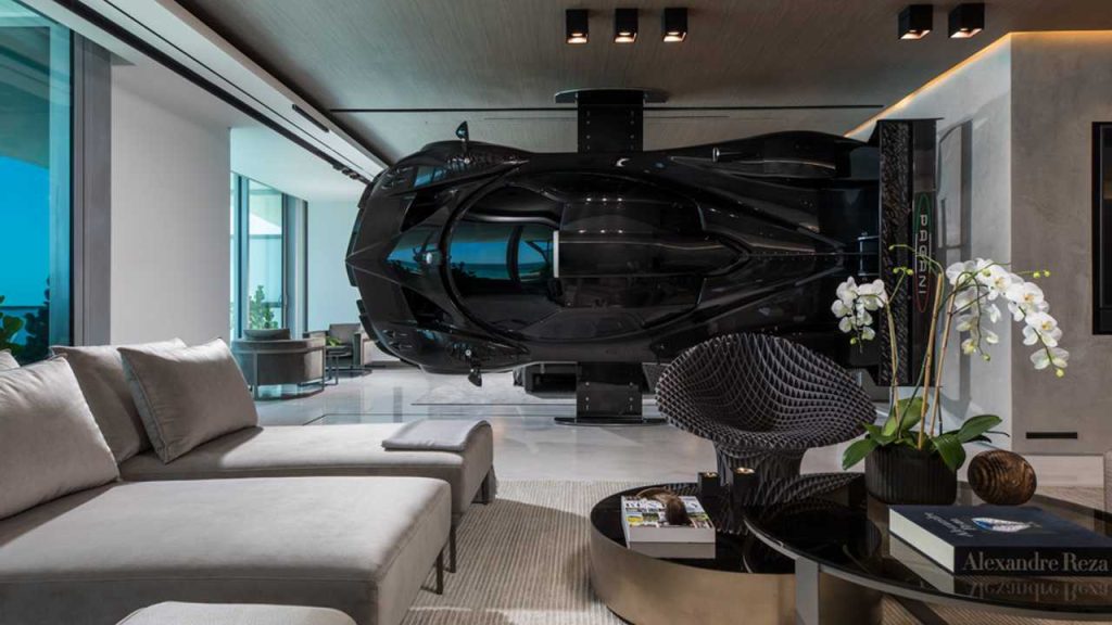 The residence has been curated in dialogue with the car’s presence. Clean lines, bold contours, and a restrained palette amplify the drama of the floating masterpiece, allowing it to dominate without overwhelming. Floor-to-ceiling ocean views provide a serene counterpoint to the kinetic energy embodied in the Zonda’s form.