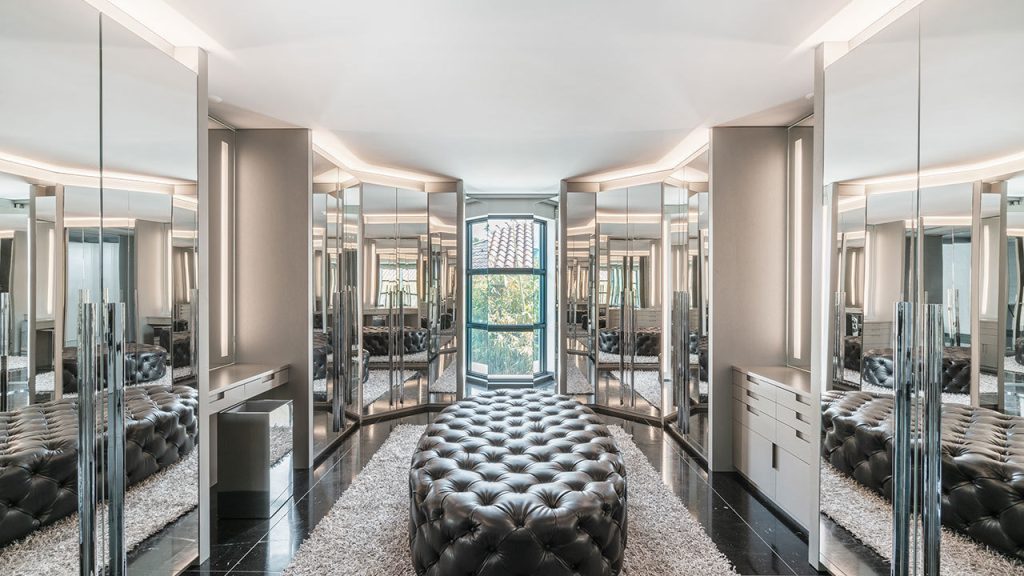 Designed for both indulgence and entertainment, the estate features a 50-foot geothermal pool, a dedicated meditation room, and a dramatic rooftop terrace inspired by the flying bridge of a superyacht—complete with a sleek wet bar and elevated entertaining spaces. A newly constructed private dock accommodates vessels up to 100 feet, with additional lifts for jet skis, seamlessly blending luxury living with a yachting lifestyle.