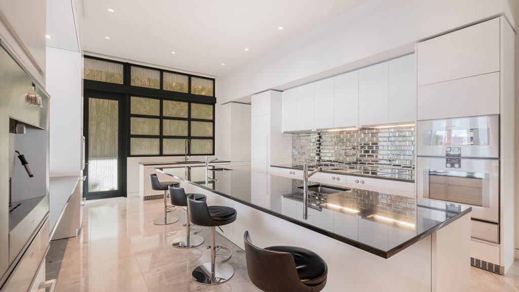 Inside, every detail is meticulously curated—from a bespoke Swiss-crafted kitchen outfitted with top-tier appliances to a discreet, James Bond–inspired hidden liquor cabinet tucked within the media room. Architectural highlights include soaring 14-foot ceilings, floor-to-ceiling glass walls, a gas fireplace, and a grand illuminated staircase that anchors the home with sculptural presence. Advanced smart-home security and full soundproofing ensure both comfort and absolute privacy.