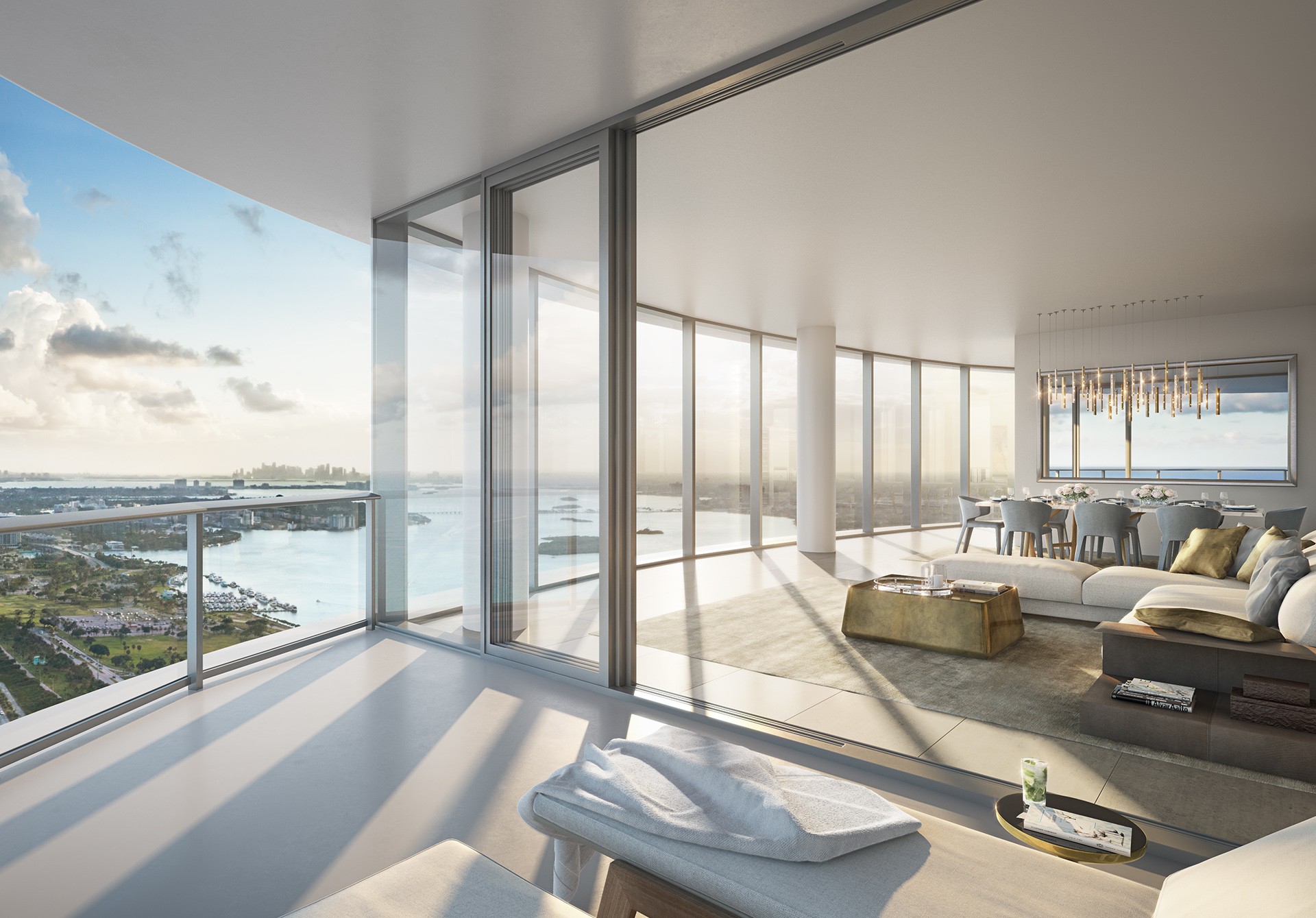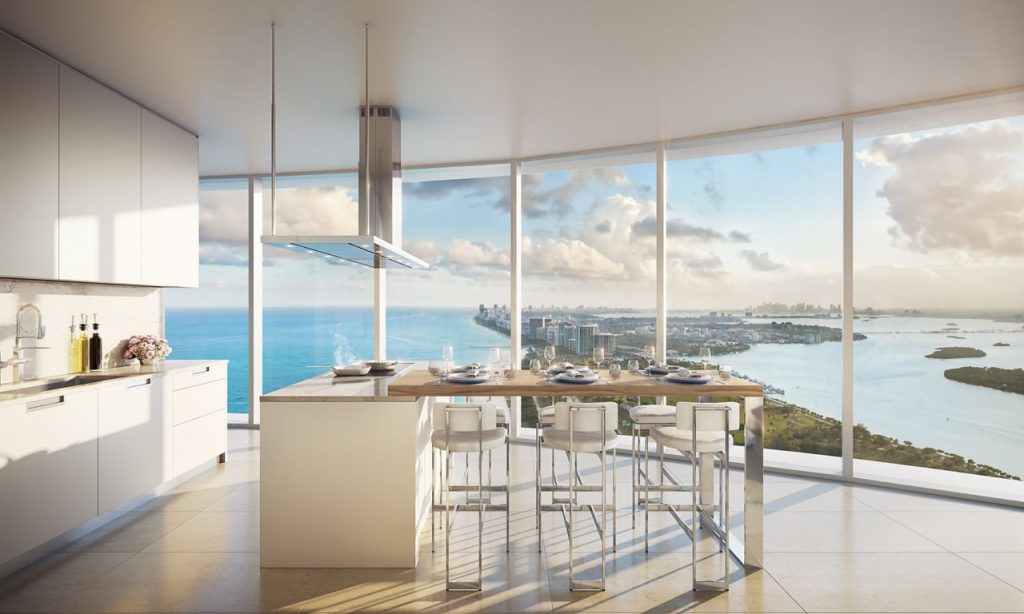 The kitchen—both sculptural and highly functional—frames sweeping views of the Miami skyline, seamlessly connecting indoor elegance with the ever-present horizon beyond. Every space is thoughtfully positioned to capture light, scale, and the quiet drama of oceanfront living.