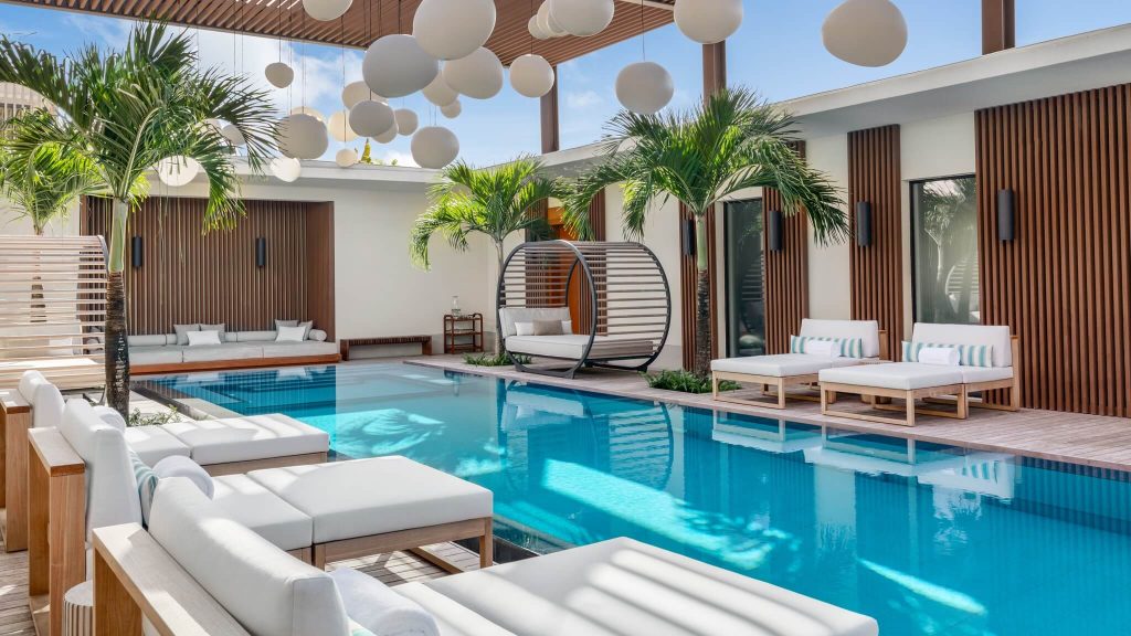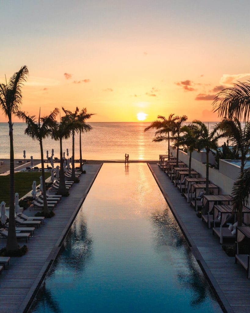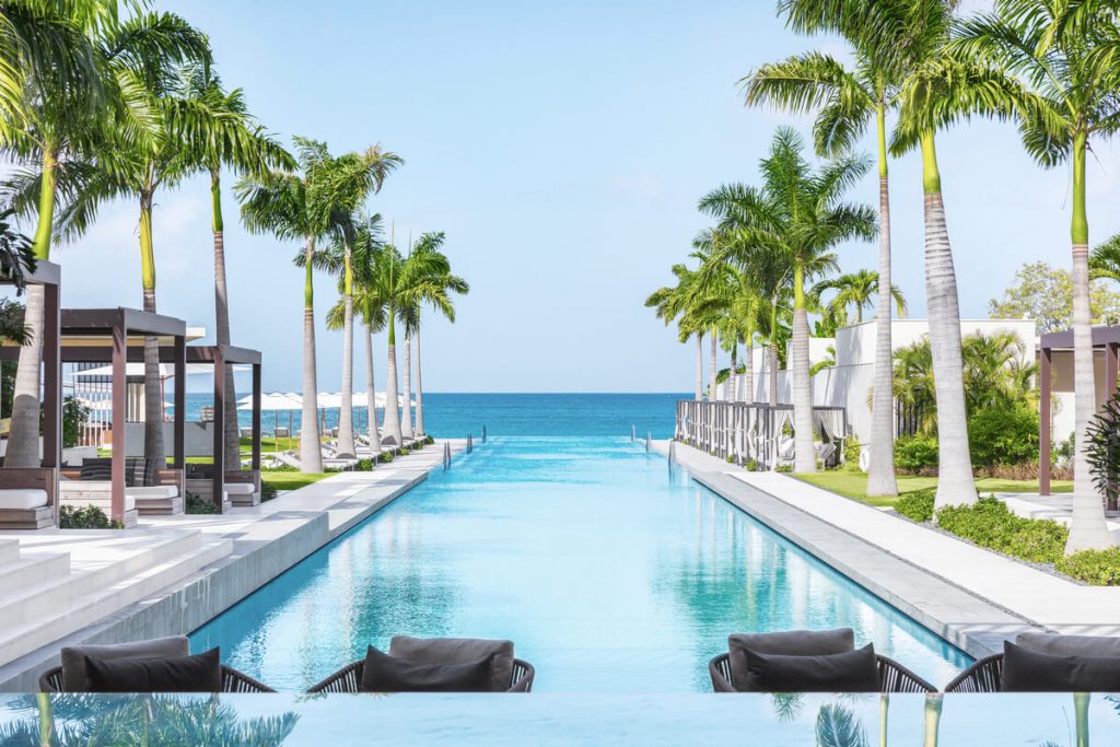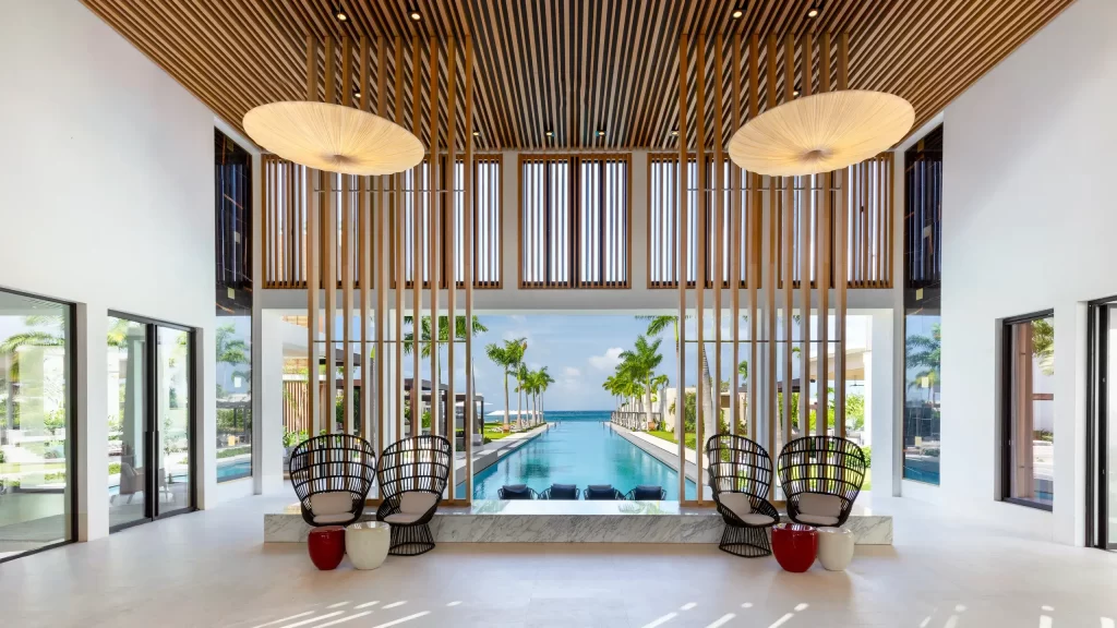 Framed by stately royal palms, the resort’s striking 100-meter infinity pool draws the eye from the open-air lobby straight to the Caribbean Sea. Here, contemporary architecture meets thoughtful landscaping and ambient lighting, creating a harmonious balance that feels both modern and timeless.