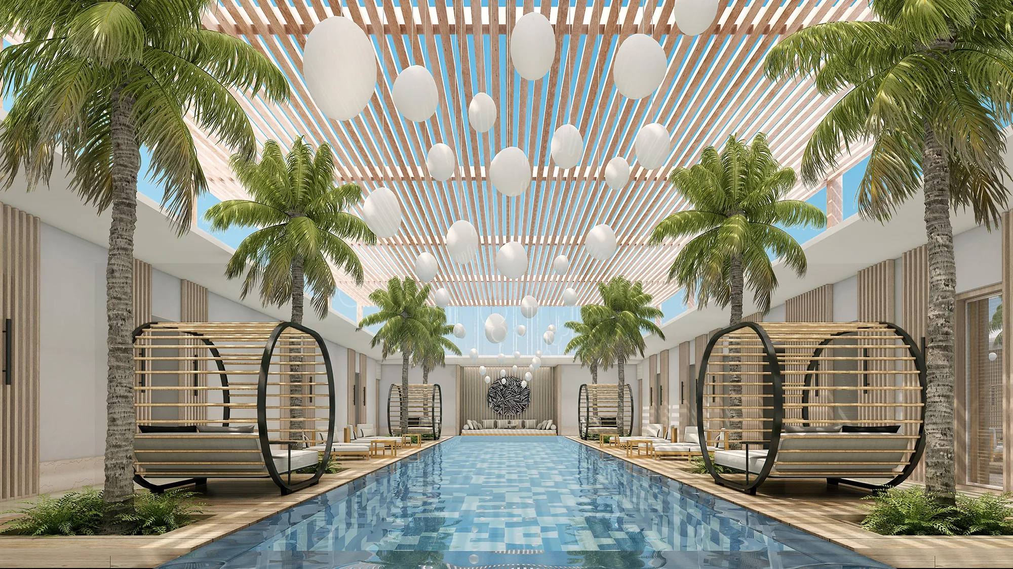 Framed by stately royal palms, the resort’s striking 100-meter infinity pool draws the eye from the open-air lobby straight to the Caribbean Sea. Here, contemporary architecture meets thoughtful landscaping and ambient lighting, creating a harmonious balance that feels both modern and timeless.