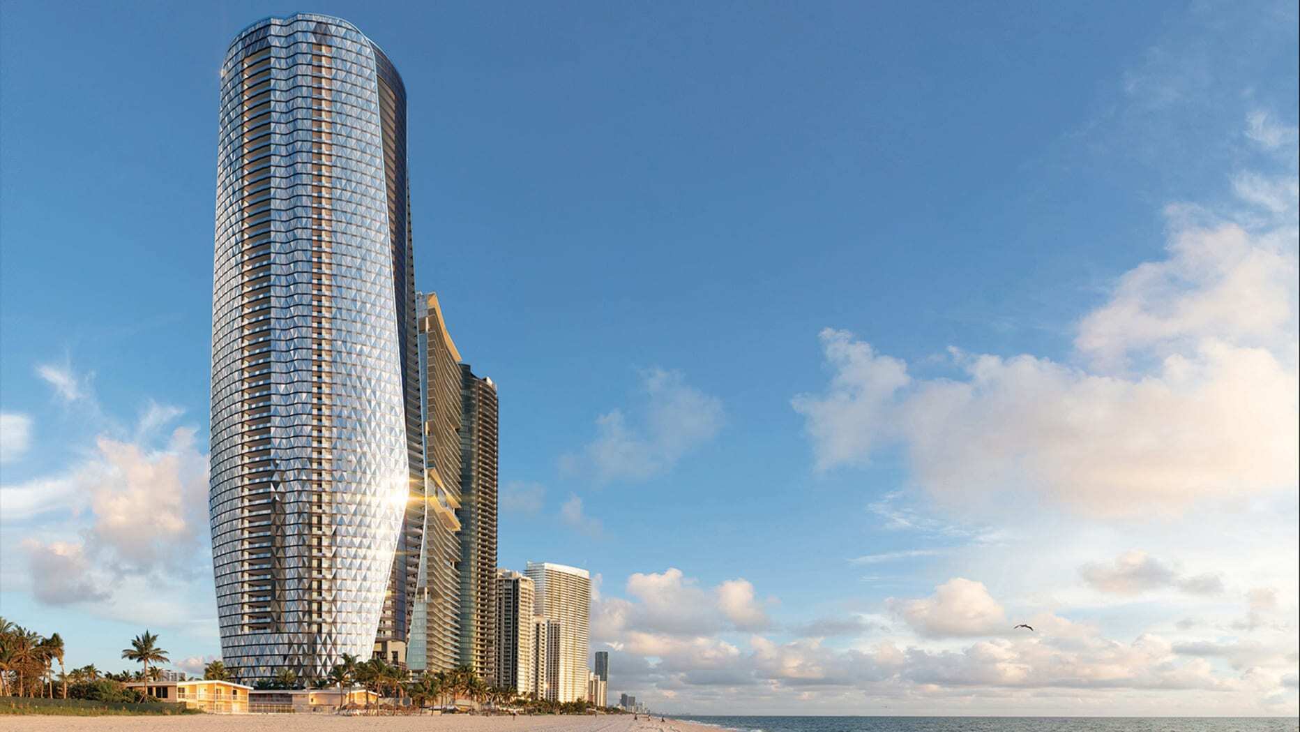 The tower will represent Bentley. This tower-brand licensing deal is complex. First, Bentley vehicles have diamond stitching on the leather seating surfaces, so that diamond pattern was added to the building’s exterior glass to make it instantly recognizable as a Bentley. The apartments have the same metal feel as cars. For Bentley knurling, they make their own faucet handles, door handles, etc.