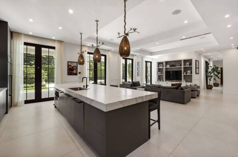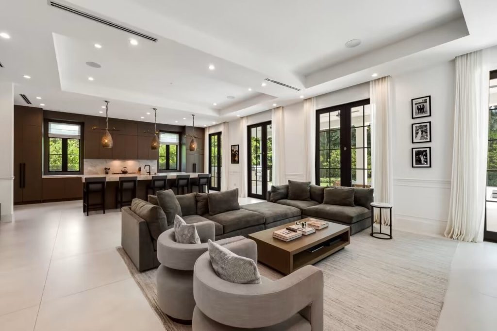 The property boasts seven bedrooms and eight bathrooms, along with a formal dining area, a media room, a breakfast area, and a chef’s kitchen complete with a spacious island.