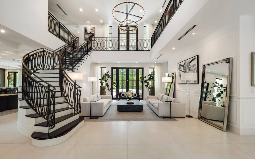 The interior of the property features a grand staircase that leads to the upper rooms, including a private primary suite located in a separate wing. The addition of a mezzanine enhances the architectural design by introducing elements of drama and depth.