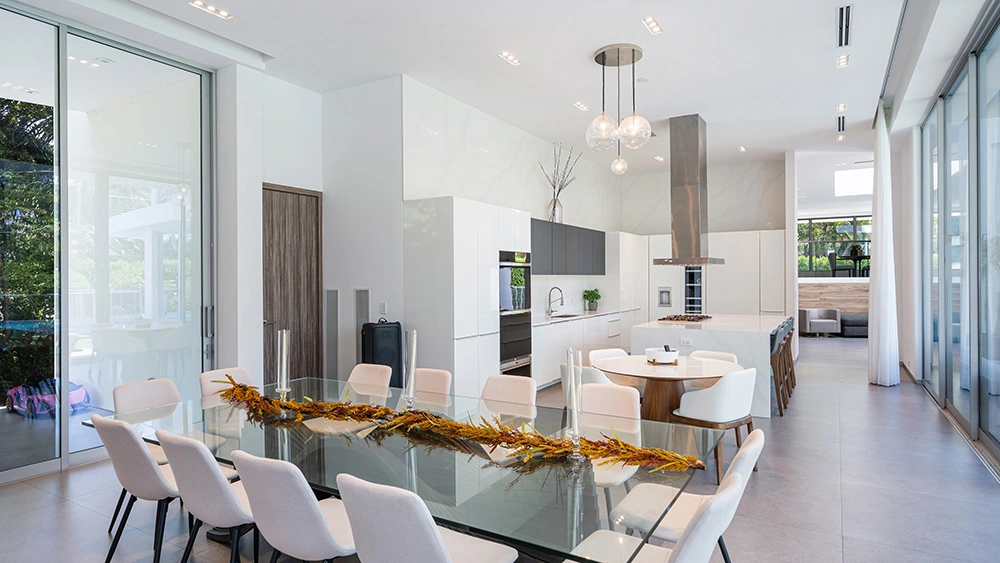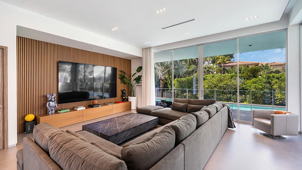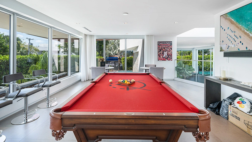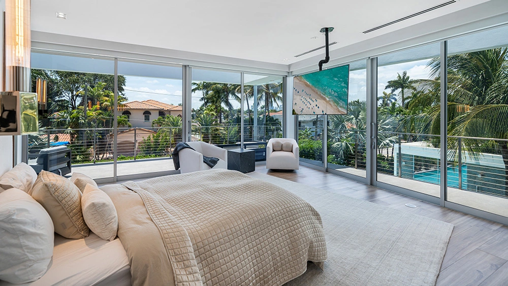 If the square footage of the Hibiscus Island property is enough, the property has high ceilings and panoramic doors that let in stunning vistas. A few of the bedrooms have their own bathrooms, and the main suite has two walk-in closets.