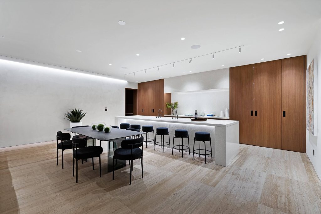 The chef’s kitchen is a highlight of Villa Mallorca, equipped with a full Kosher setup. Dual sinks, Thermador appliances, and a Gaggenau gas range cooktop make cooking a delightful experience. An independent butler’s pantry and utility room add convenience, streamlining everyday living for residents.